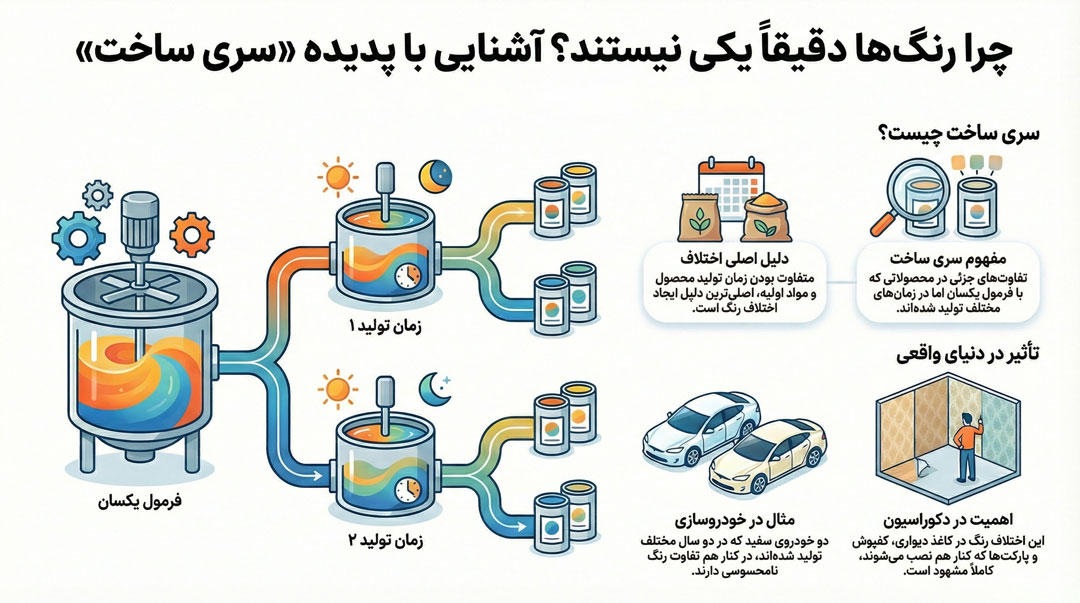 سری ساخت در هر محصولی وجود دارد و این مورد را میشود در ماشین ها و رنگ ها و حتی مواد مصرفی هم به خوبی تشخیص داد. به طور مثال اگر شما دو اتومبیل سفید را در نظر بگرید با رنگ سفید، ماشینی که در سال قبل ساخته شده و با ماشینی که امسال تولید شده یک رنگ هستند، اما اگر در کنار یکدیگر قرار بگیرند و به خوبی و کارشناسی شده بخواهید مقایسه کنید، رنگ دو ماشین به مقدار کمی تیره و روشنی با هم اختلاف دارند. دلیل این است که زمان ساخت این دو اتومبیل متفاوت است با اینکه رنگ ها با یک فرمول ثابت تولید میشوند و اصلی ترین دلیل این اختلاف رنگ متفاوت بودن زمان تولید و متفاوت بودن زمان ساخت رنگ ها است. در اصل همین موضوع نیز در اکثر محصولات وجود دارد و ما در مورد کاغذ دیواری و حتی کفپوش ها و پارکت ها و کالا های دکوری که در کنار یکدیگر قرار است اجرا شوند وجود دارد و باعث بوجود آمدن اختلاف رنگ میشود.