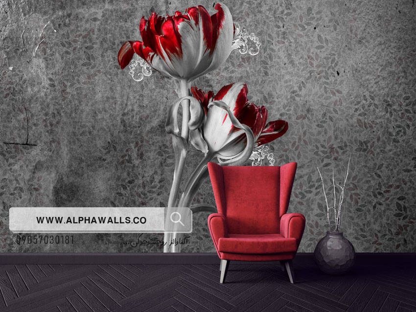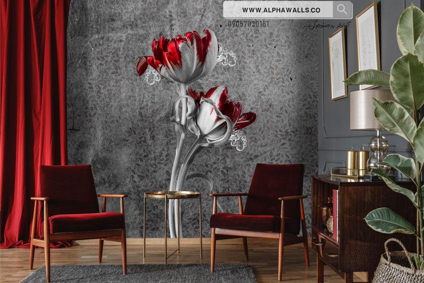 گلهای لاله با رنگ قرمز در مرکز تصویر، حس جذابیت، هیجان کنترلشده و قدرت را وارد فضا میکنند. قرمز، رنگی است که همیشه توجه را به خود جلب میکند و باعث میشود دیوار شاخص اتاق تبدیل به نقطه تمرکز شود.