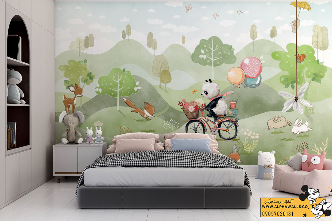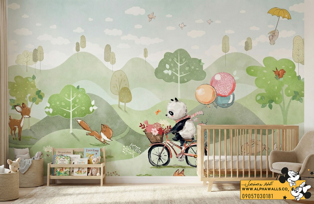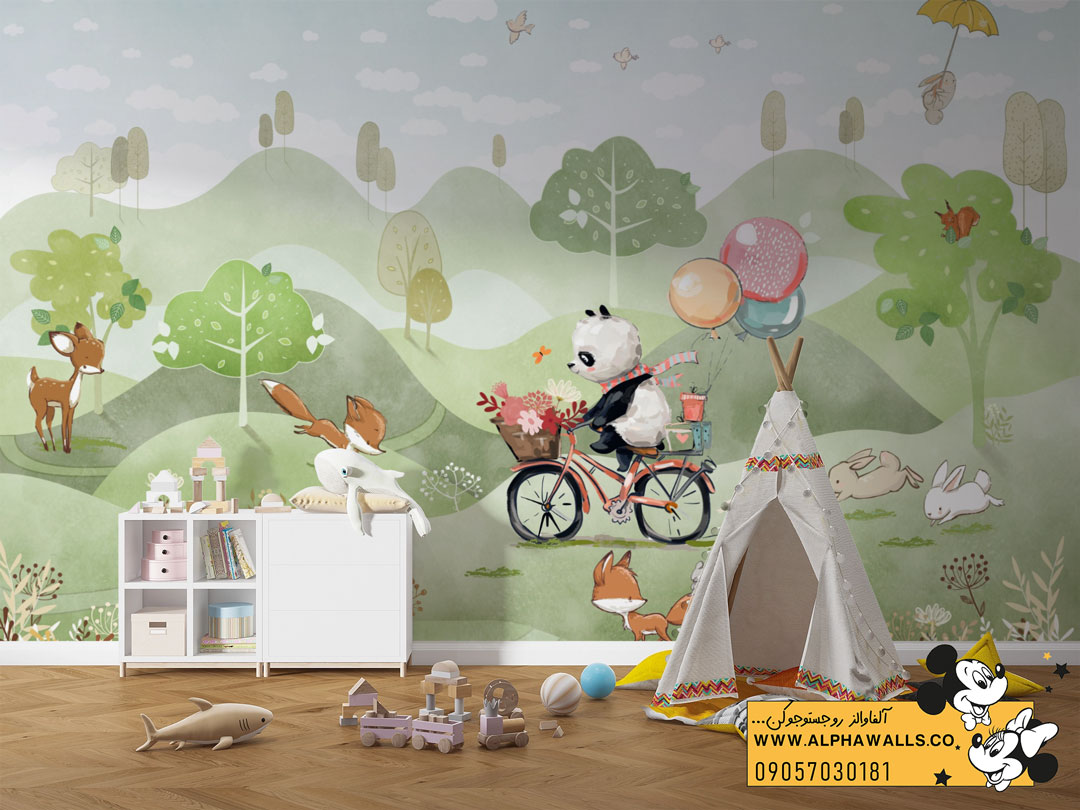 پوستر دیواری کودکانه طرح پاندا دوچرخه‌سوار در جنگل