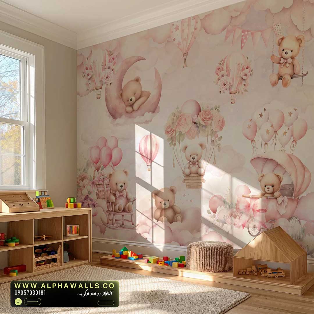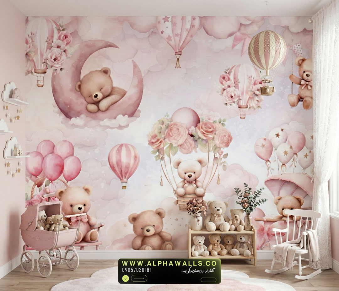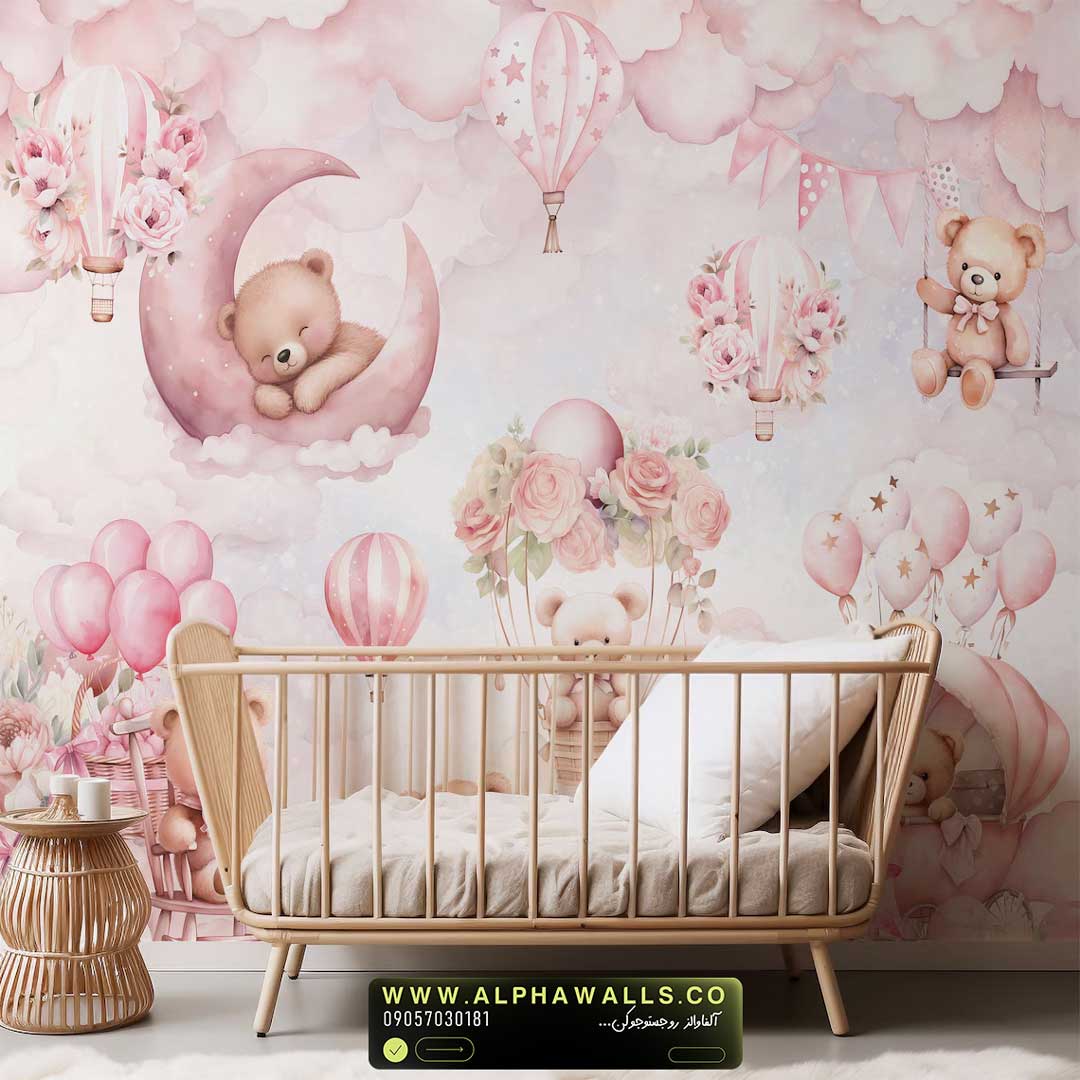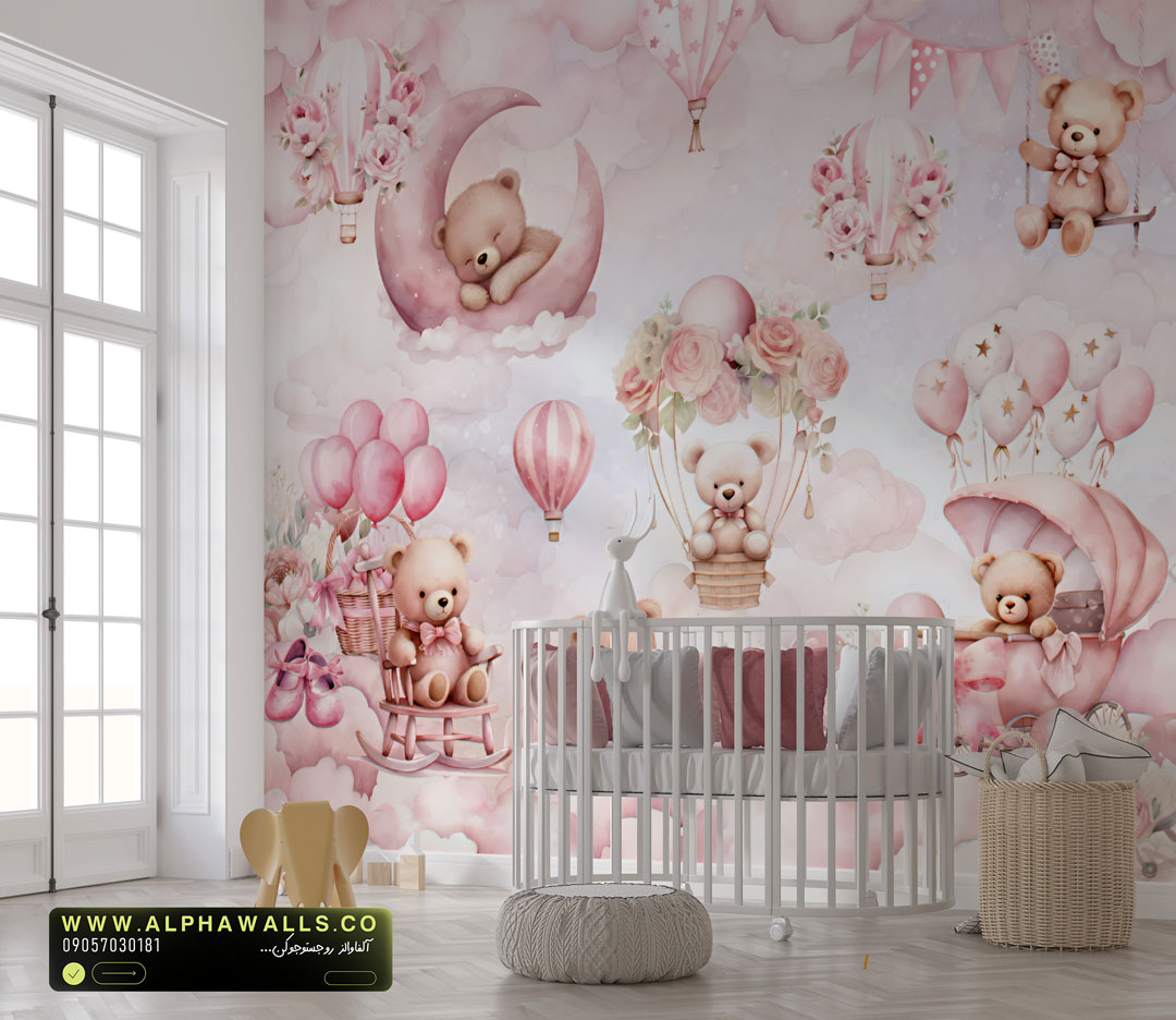 پوستر دیواری کودک طرح خرس‌های صورتی در آسمان رویایی