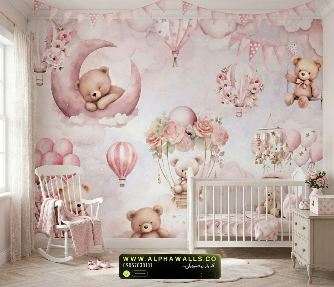 این پوستر دیواری کودک با تصویر خرس‌های عروسکی میان ابرها، بالن‌ها و گل‌های رز فضایی کاملاً رویایی و آرام برای اتاق نوزاد ایجاد می‌کند. ترکیب ماه هلالی، ابرهای نرم و پالت صورتی پاستلی، محیطی امن و احساسی می‌سازد که مخصوص سال‌های ابتدایی رشد کودک طراحی شده است.