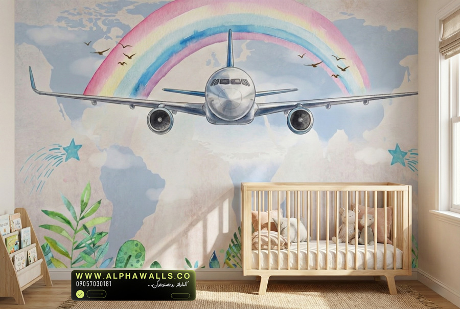 پوستر دیواری کودکانه طرح هواپیما و رنگینکمان