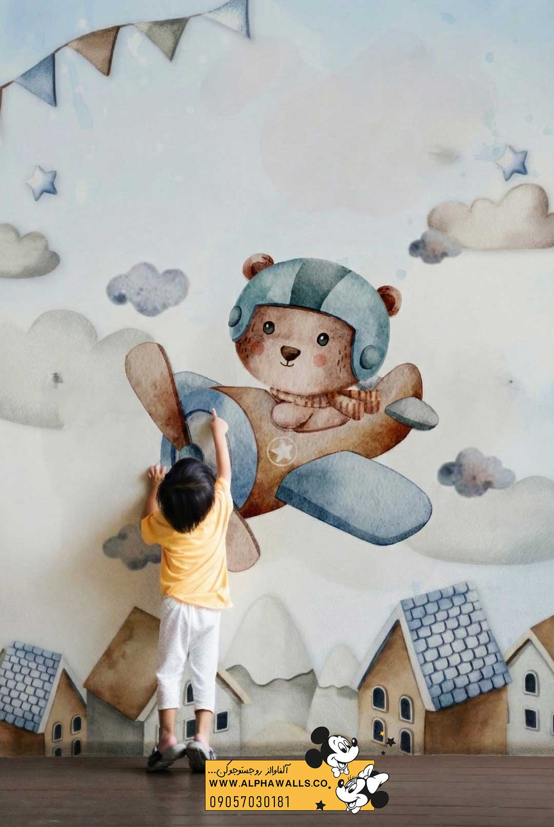 پوستر دیواری کودکانه طرح خرس خلبان آبرنگی – فضای آرام، امن و خیالانگیز برای اتاق کودک
