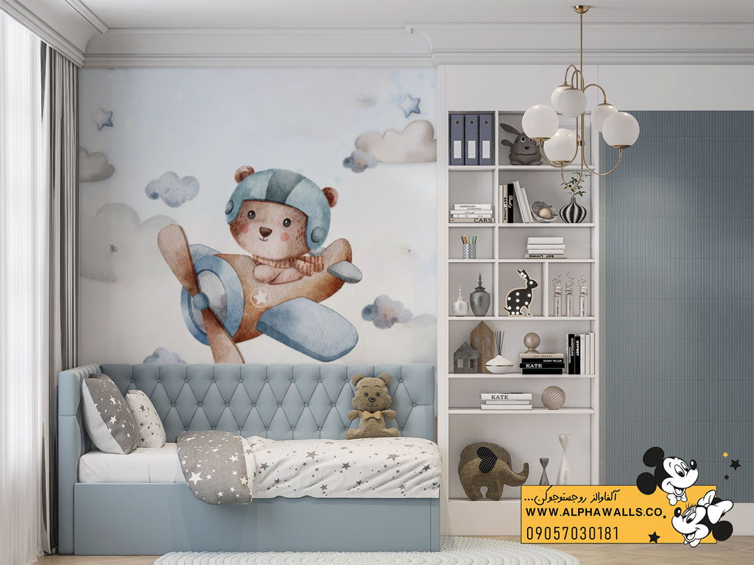 پوستر دیواری طرح خرس خلبان آبرنگی یکی از لطیفترین و آرامترین طرحهای کودکانه آلفا والز است. تصویر یک خرس مهربان با کلاه خلبانی که سوار هواپیمای کوچک در میان ابرها پرواز میکند، فضایی سرشار از آرامش، امنیت و رؤیاپردازی کودکانه ایجاد میکند.