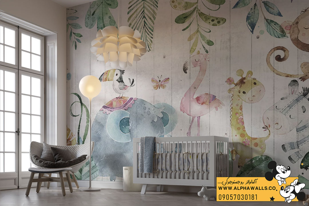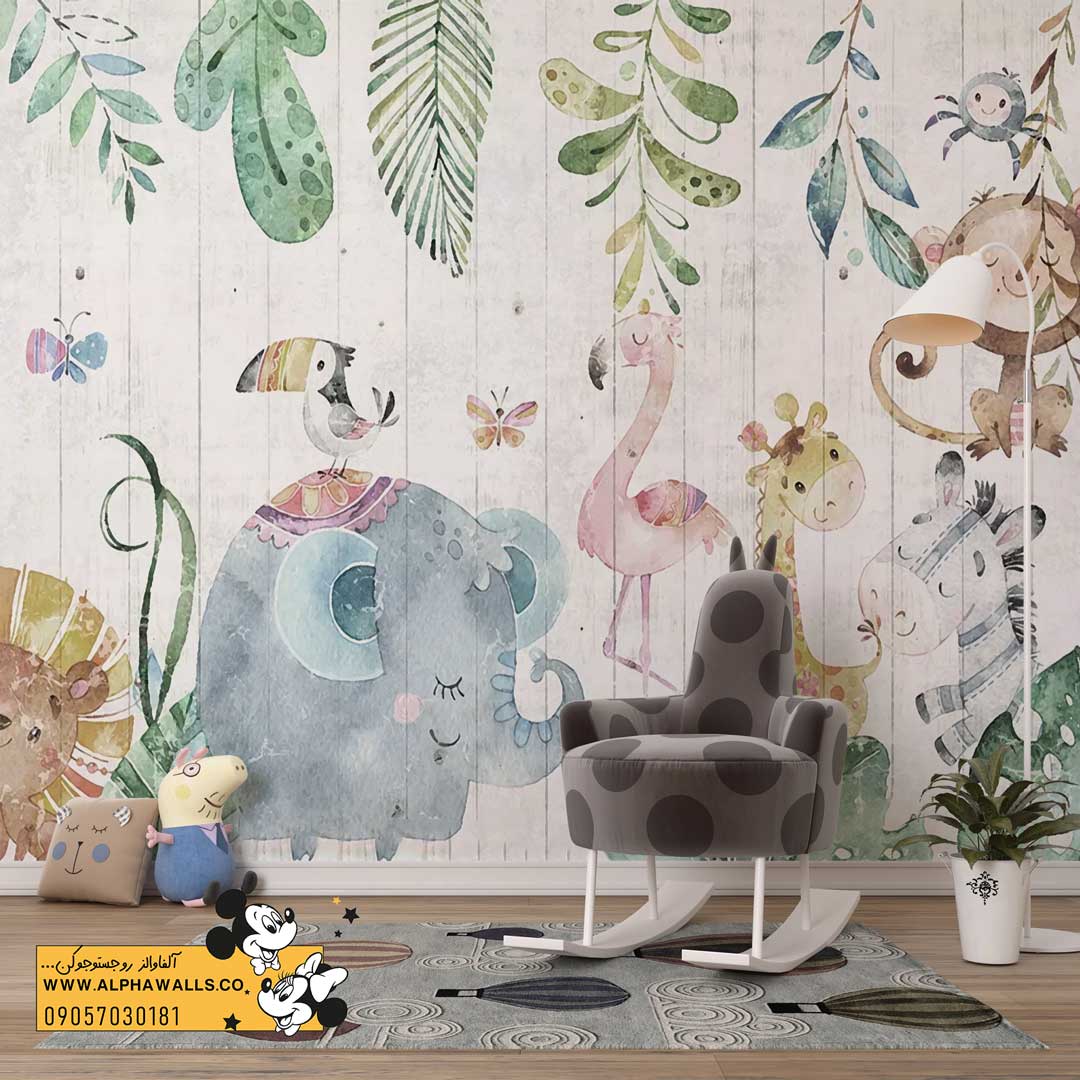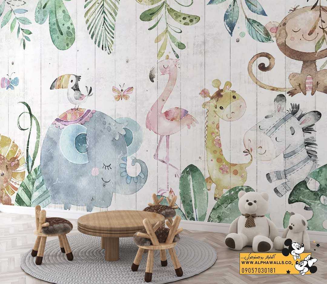 پوستر دیواری طرح حیوانات جنگلی آبرنگی یکی از آرام‌ترین و دلنشین‌ترین طرح‌های کودکانه آلفا والز است. در این پوستر، حیوانات مهربانی مثل فیل، زرافه، فلامینگو، پرنده و پروانه با سبک آبرنگی و رنگ‌های ملایم روی زمینه‌ای شبیه چوب روشن طراحی شده‌اند؛ ترکیبی که حس طبیعت، امنیت و لطافت را به اتاق کودک منتقل می‌کند.