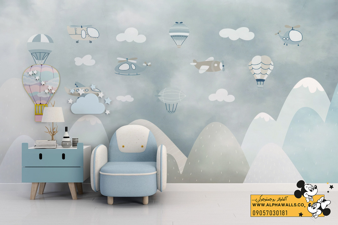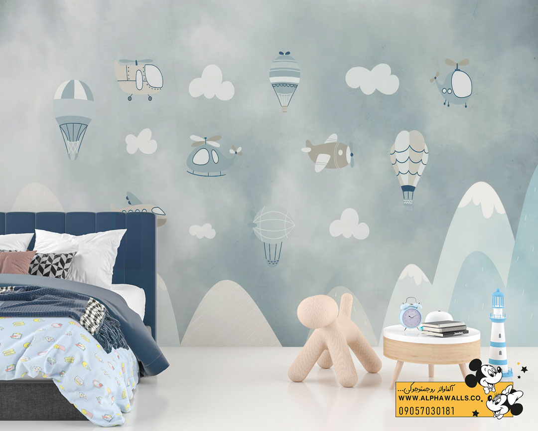 پوستر دیواری طرح وسایل پرنده و بالن‌های فانتزی با طراحی مینیمال و رنگ‌های ملایم، فضایی بسیار آرام، منظم و خیال‌انگیز برای اتاق کودک ایجاد می‌کند. در این طرح، المان‌هایی مانند بالن هوایی، هواپیما، هلیکوپتر و ابرهای نرم در پس‌زمینه‌ای آبی‌–خاکستری لطیف قرار گرفته‌اند تا حس پرواز، حرکت و کشف دنیا را بدون ایجاد هیجان افراطی به کودک منتقل کنند.
