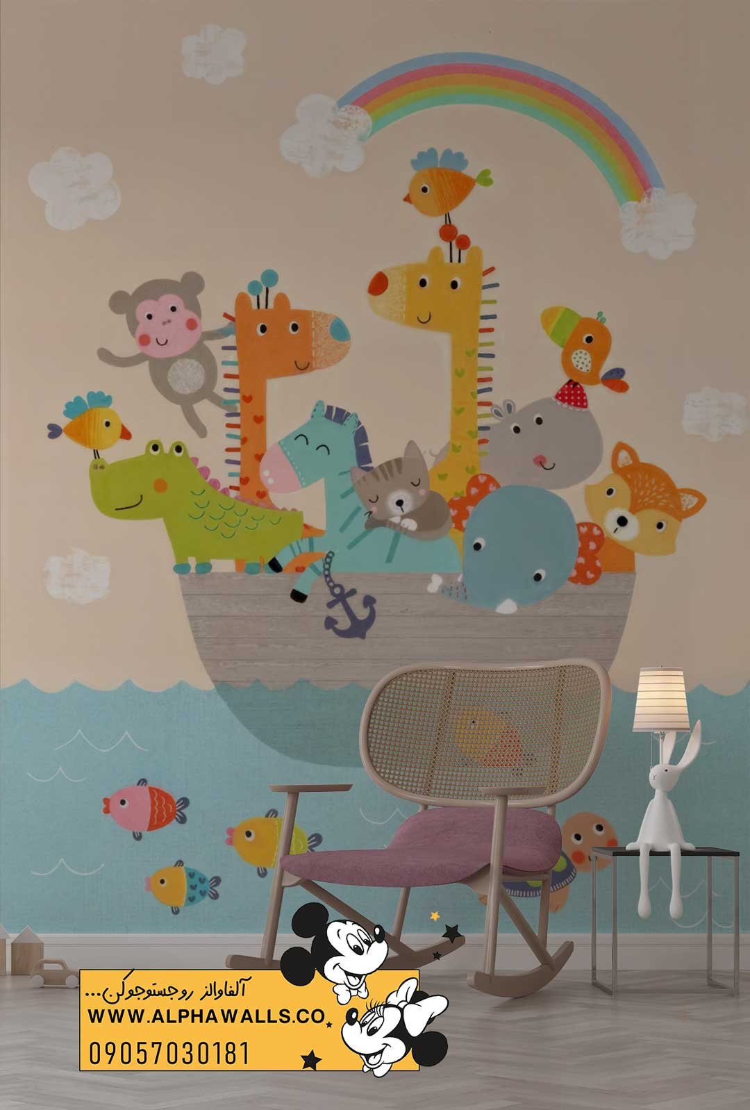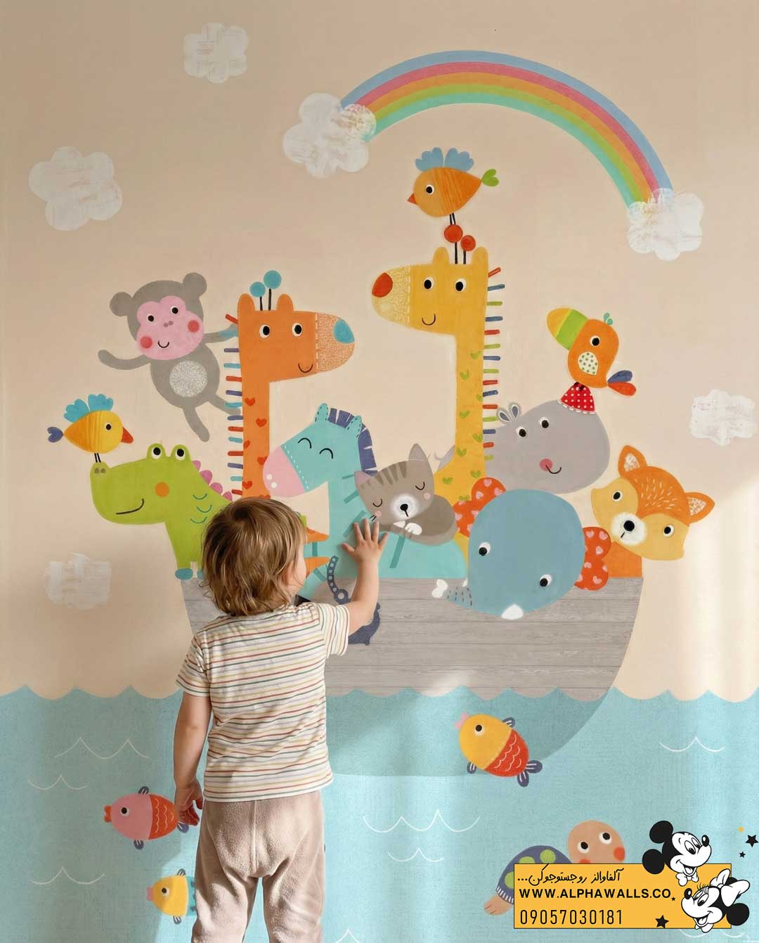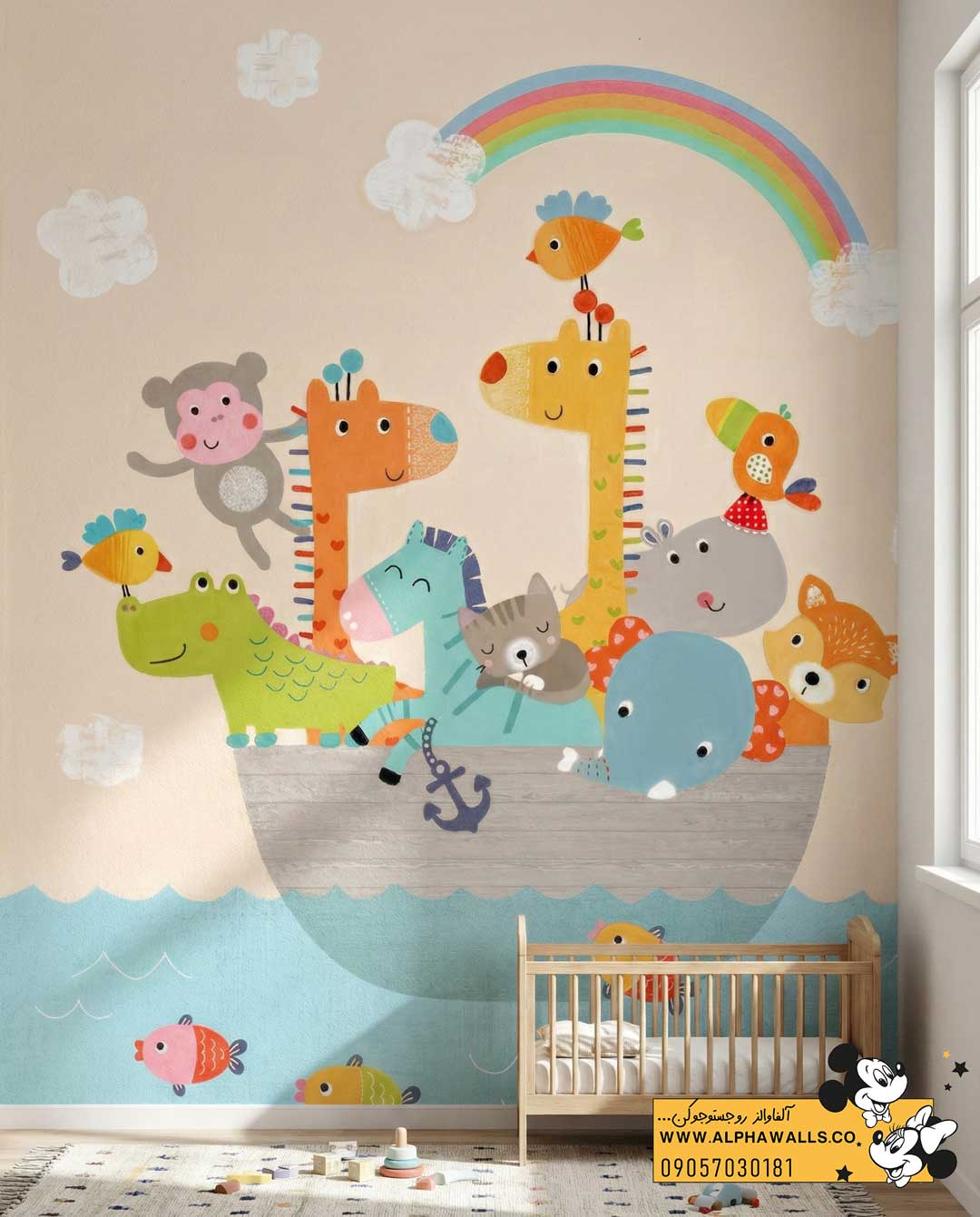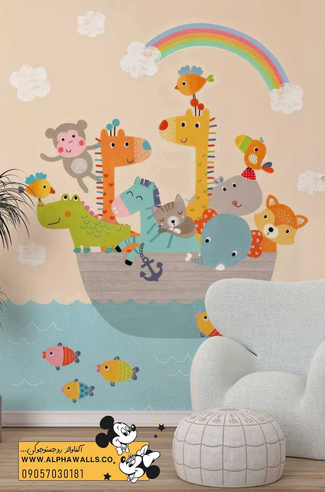 پوستر دیواری کودک طرح کشتی حیوانات و رنگینکمان