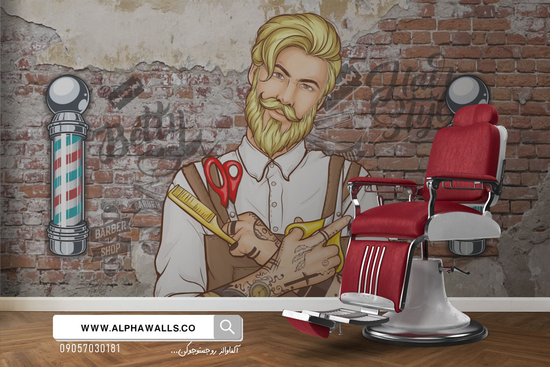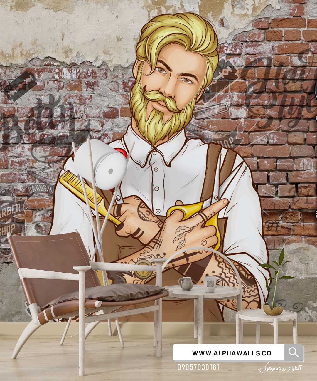 پوستر دیواری آرایشگاه مردانه طرح کاراکتر بلوند با پسزمینه آجری