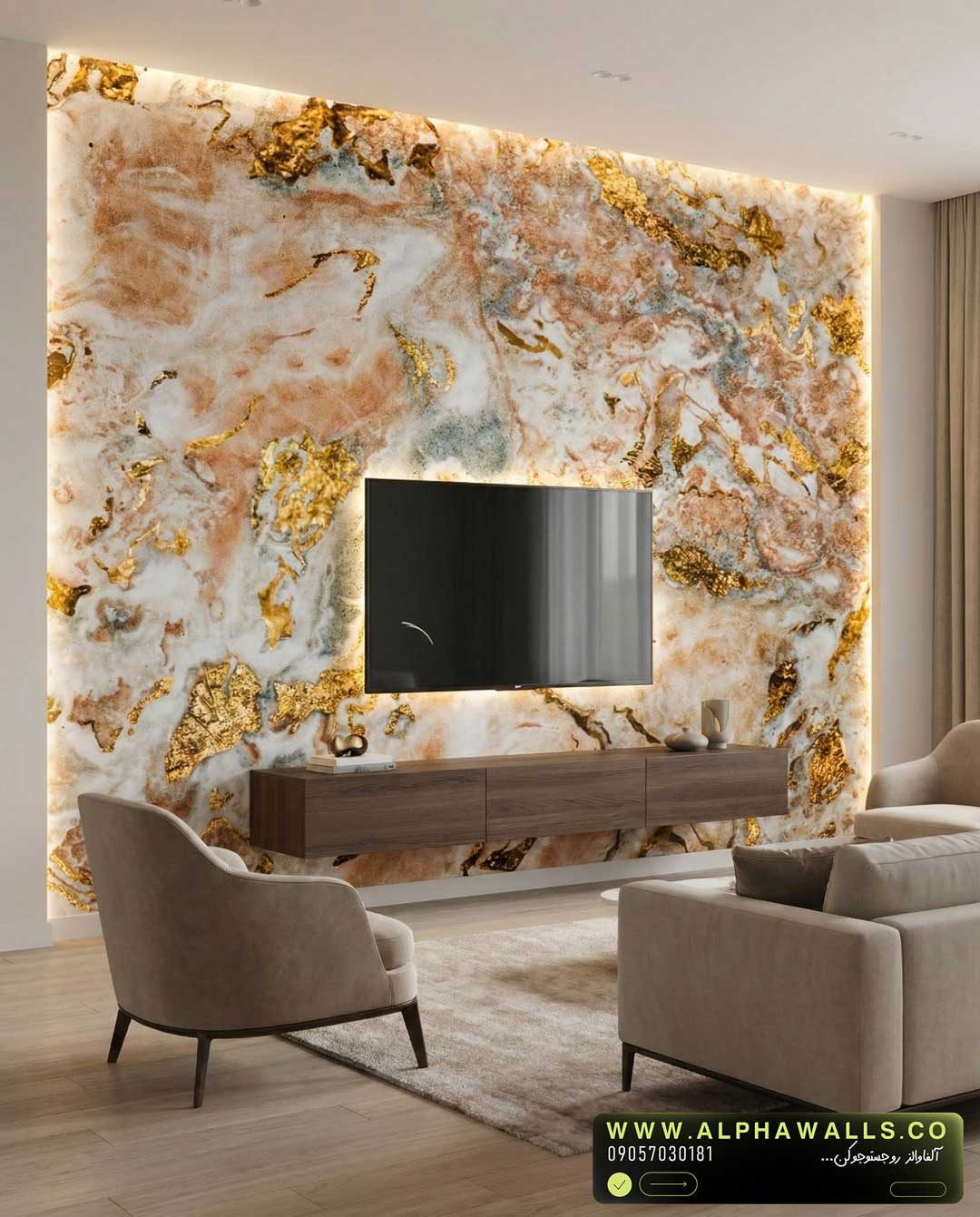 این طرح مناسب دیوارهایی با عرض بیشتر از ۳۰۰ سانتیمتر است و در دیوارهای شاخص مانند دیوار پشت تلویزیون، جلوهای یکپارچه و چشمنواز ایجاد میکند. رنگهای روشن به بزرگتر دیدهشدن فضا کمک کرده و رگههای طلایی حس لوکس و کیفیت را بدون اغراق به دکوراسیون اضافه میکنند.