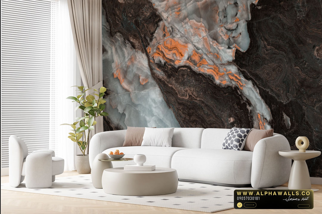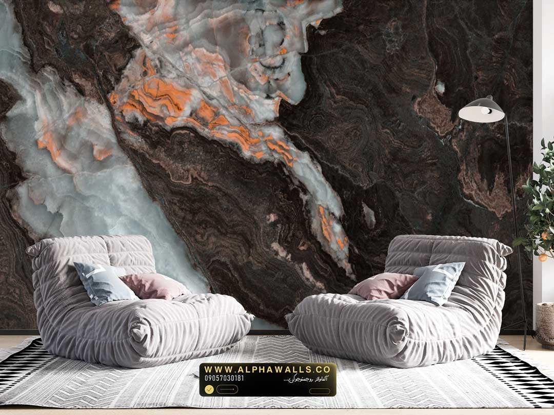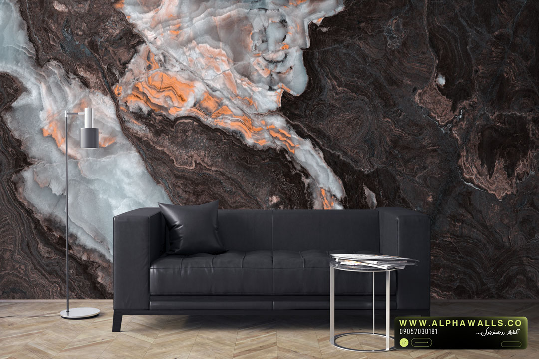 این پوستر دیواری طرح سنگ اونیکس تیره با زمینهای عمیق و رگههای مسی گرم، انتخابی شاخص برای فضاهایی است که به دنبال جلوهای مدرن، قدرتمند و در عین حال گرم هستند. حرکت سیال رگهها، بدون ایجاد شلوغی، دیوار را به نقطه کانونی فضا تبدیل کرده و شخصیت بصری قدرتمندی ایجاد میکند.