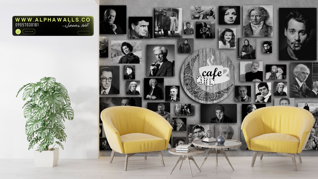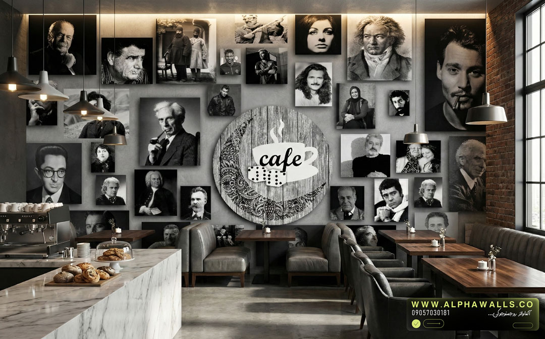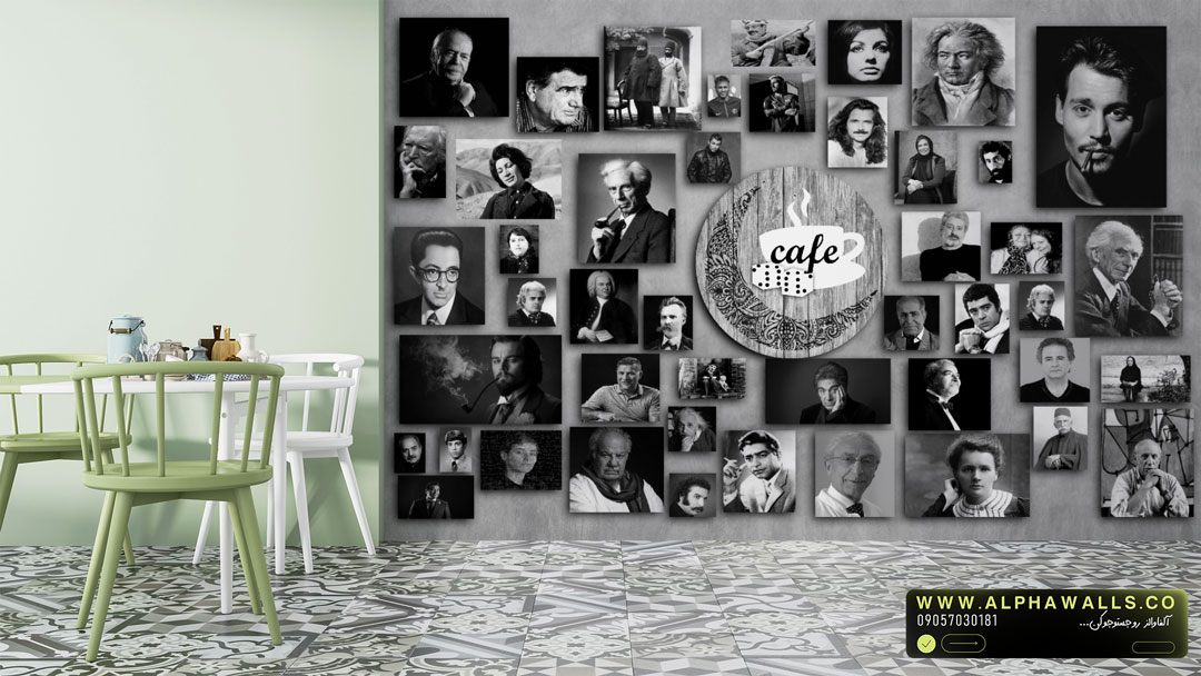 پوستر دیواری کافه طرح گالری پرتره مشاهیر با سبک هنری مونوکروم