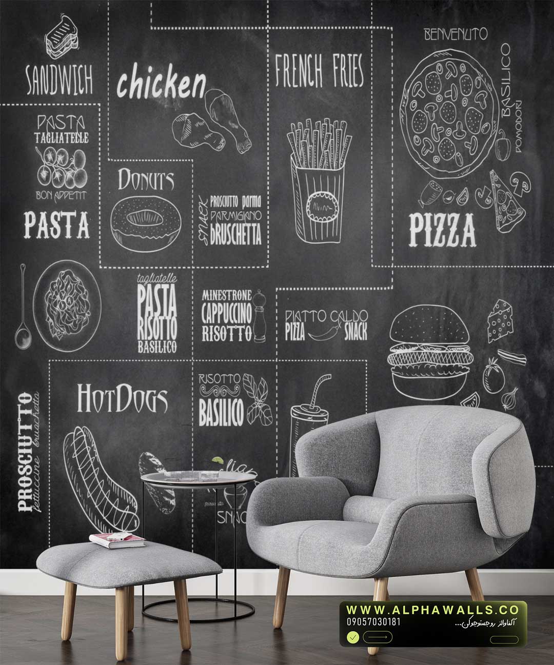 این پوستر دیواری با الهام از منوهای گچی کلاسیک رستورانها و فستفودهای اروپایی طراحی شده و ترکیبی از نقاشیهای خطی غذا، تایپوگرافی دستی و پسزمینهای شبیه تختهسیاه را به نمایش میگذارد. حضور آیتمهایی مثل پیتزا، همبرگر، سیبزمینی سرخکرده، پاستا، هاتداگ و نوشیدنیها، این طرح را به یک انتخاب ایدهآل برای فضاهای غذایی تبدیل کرده است.