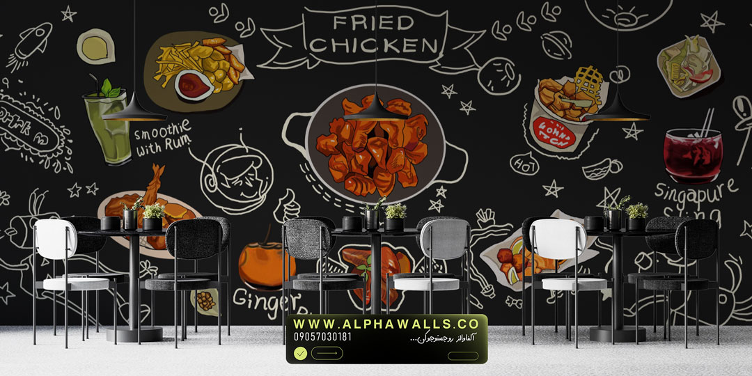 پسزمینهی مشکی مات با نقاشیهای رنگی از خوراکیها، نوشیدنی و غذاهای فستفودی مثل مرغ سوخاری، سیبزمینی سرخکرده و نوشابه باعث میشه دیوار شما مثل یک بوم هنری پر از انرژی به نظر برسه.