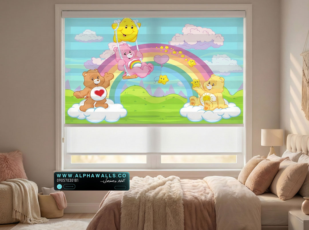پرده زبرا اتاق کودک طرح خرسهای رنگینکمانی با فضای شاد و دوستداشتنی