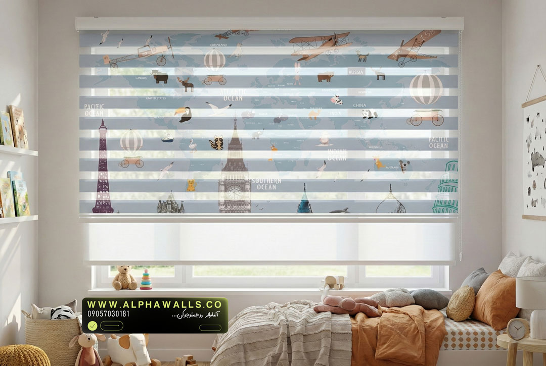 پرده زبرا اتاق کودک طرح سفر دور دنیا با المانهای آموزشی