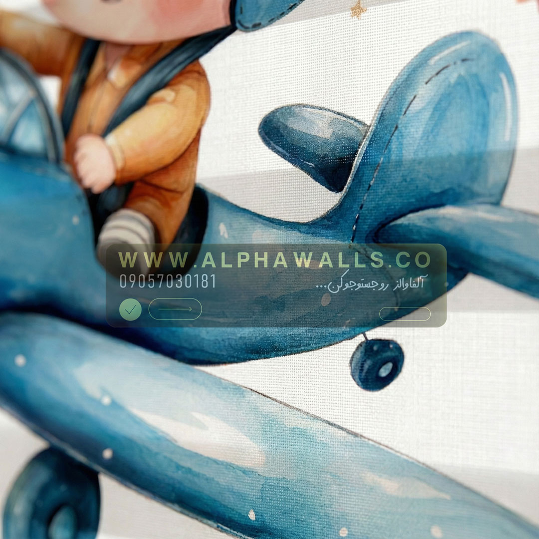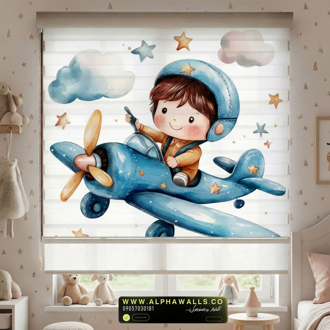 پرده زبرا اتاق کودک طرح خلبان کوچولو با هواپیمای آبی رویایی