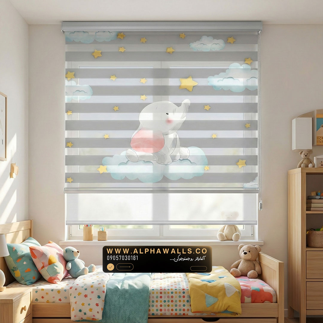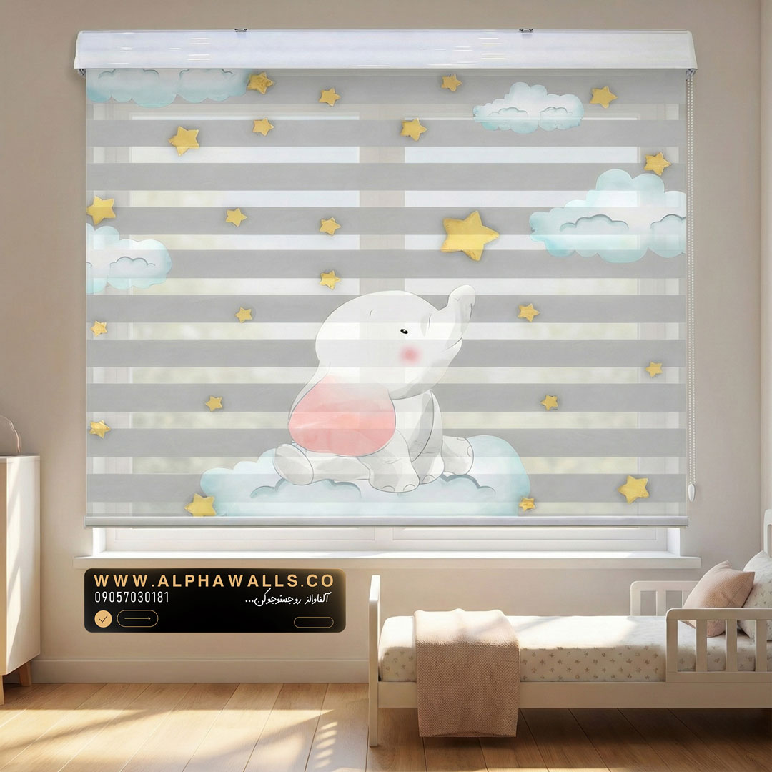 پرده زبرا کودک طرح فیل کوچولو روی ابر با تصویر فیل سفید نشسته روی ابرهای نرم و ستارههای طلایی، فضایی سرشار از آرامش، امنیت و خواب راحت برای کودک ایجاد میکند. فیل در روانشناسی کودک نماد مهربانی، حمایت، ثبات احساسی و احساس امنیت است؛ حضور آن در کنار ابرها و ستارهها، حس خیالپردازی آرام و بیخطر را تقویت کرده و به کودک کمک میکند قبل از خواب آرام شود.