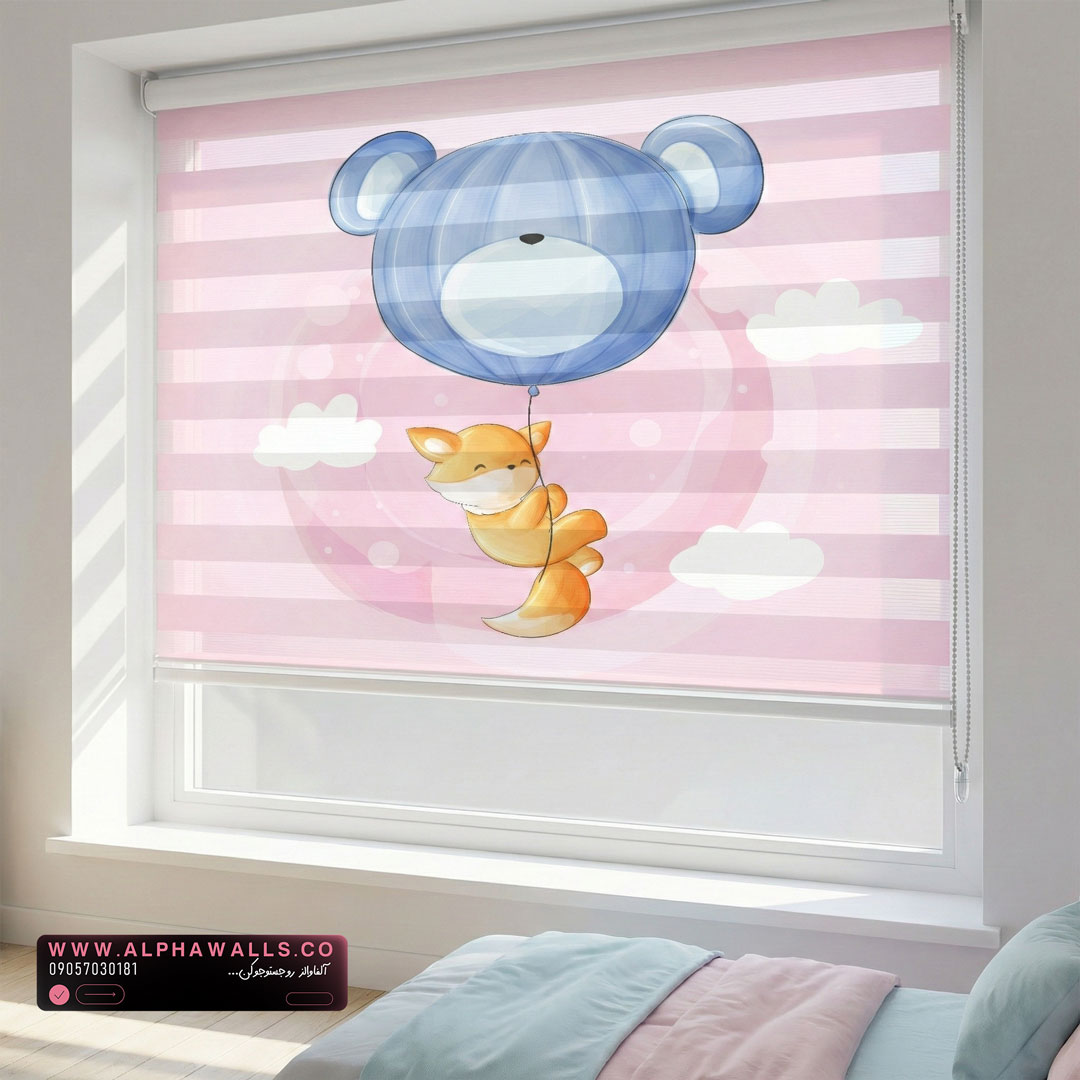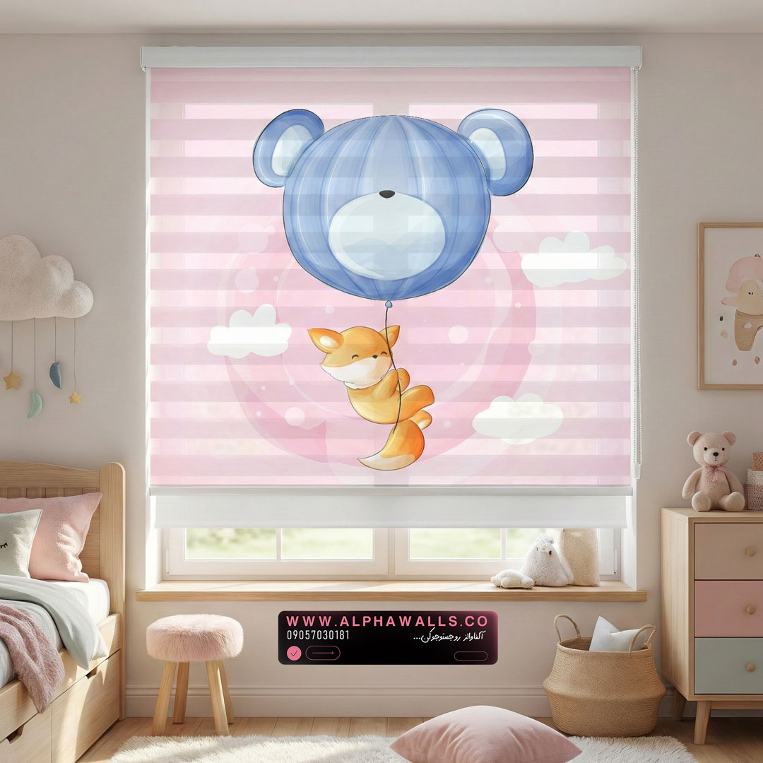 پرده زبرا کودک طرح روباه و بالن خرسی | طراحی لطیف و آرامشبخش برای اتاق نوزاد