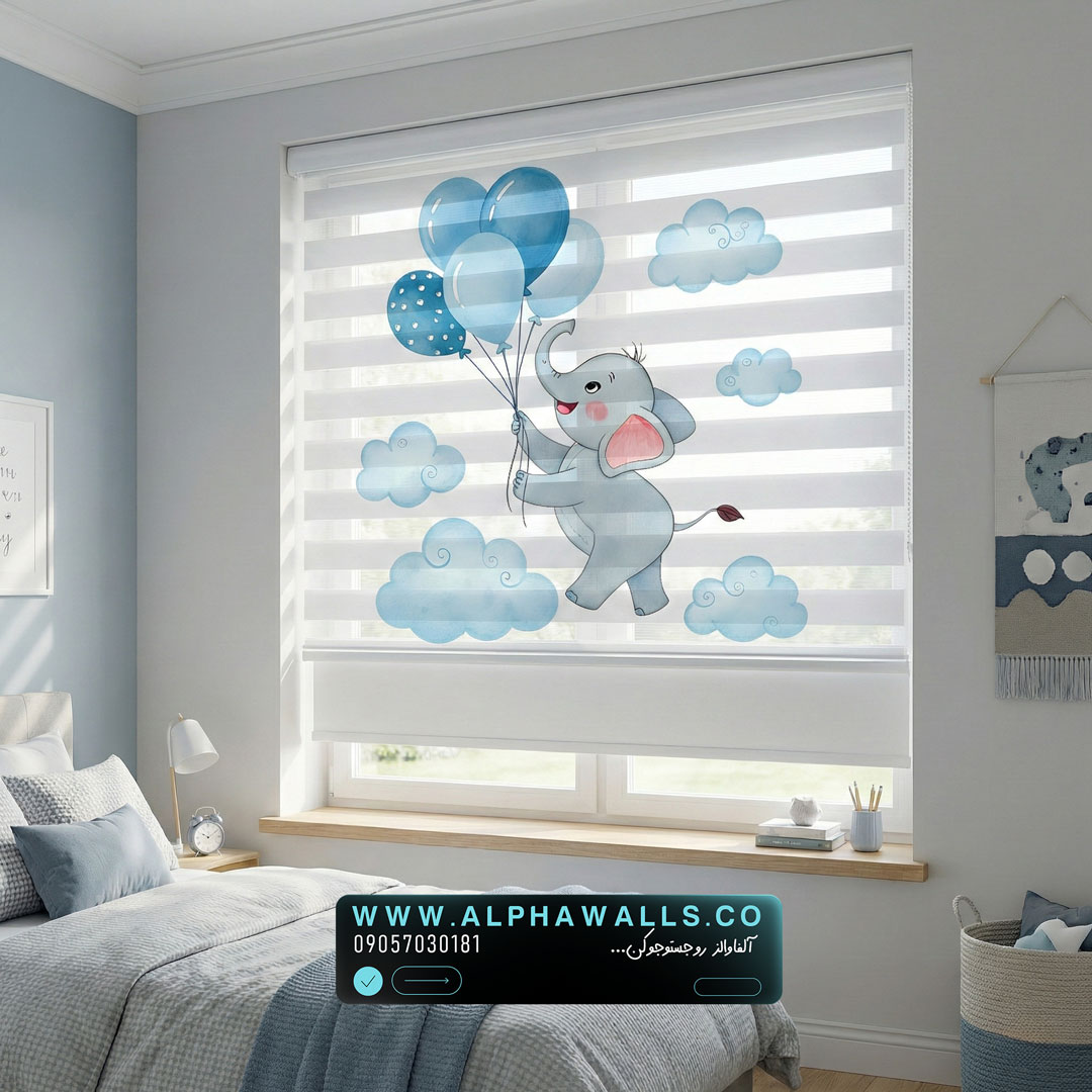 پرده زبرا کودک طرح فیل بالوندار آبی | آرامش، امنیت و خیالپردازی در اتاق کودک